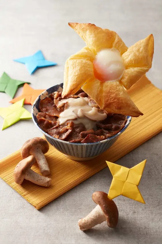法式千層燒肉丼,手裡劍的搶眼造型吸引顧客眼球,取自酥皮濃湯的概念,將酥皮混著溫泉蛋和松露蕈菇白醬與米飯一起入口,創新食感連人氣Youtuber這群人-展榮、展瑞都愛不釋口!