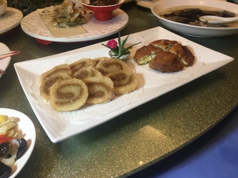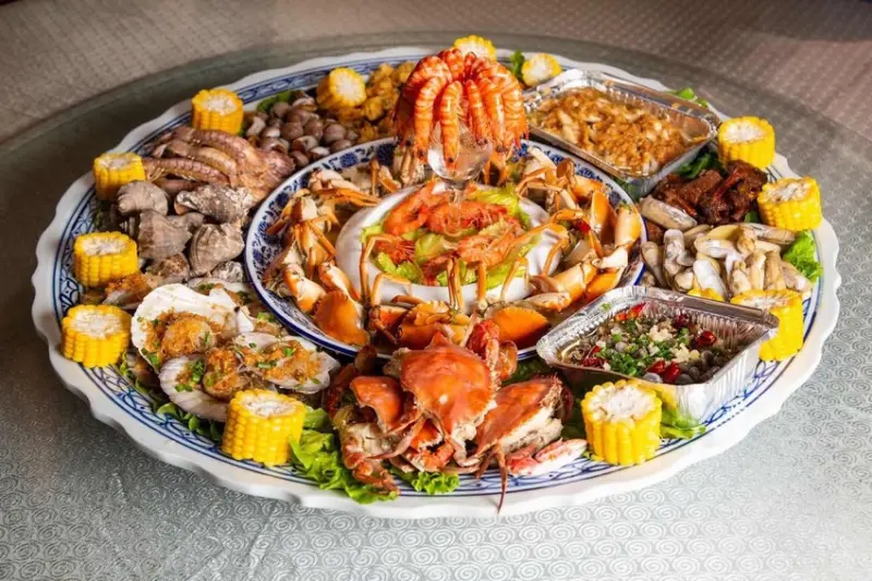土豪宴是個大盤菜的概念,視覺震撼! 直徑超過一公尺的大盤中有皮皮蝦、九節蝦、江蟹、油蠓、大蟶、扇貝、香螺、角螺、目魚、水潺、魚餅、泥螺、烤鴨、玉米,選項相當多元。