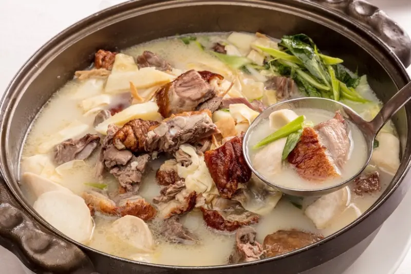 福容大飯店桃園店的「醃篤鴨骨湯」則為上海經典煲湯,取先一鴨一雞熬煮2~3小時,再以鴨架煲湯,乳白色的湯底,最後放入新鮮竹筍與蒜苗來提香解膩,每一口都是滿足!「砂鍋津白雞」也是一道經典的江浙湯品,食材同樣講究,先將整隻雞連同豬腳及大白菜以清湯、薑、酒慢火炆燉,起鍋前僅加少許鹽調味,喝得出大白菜自然鮮甜,健康無負擔。