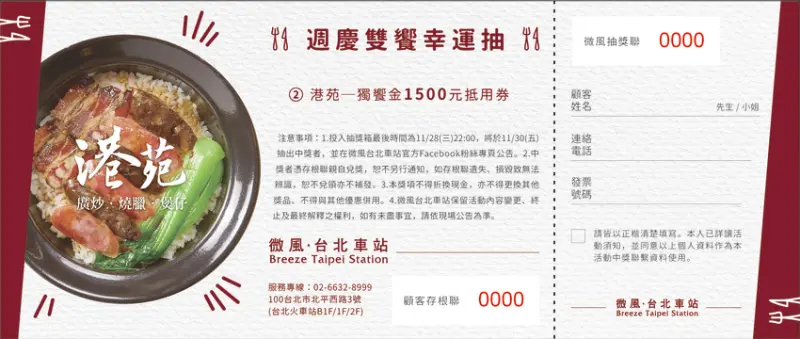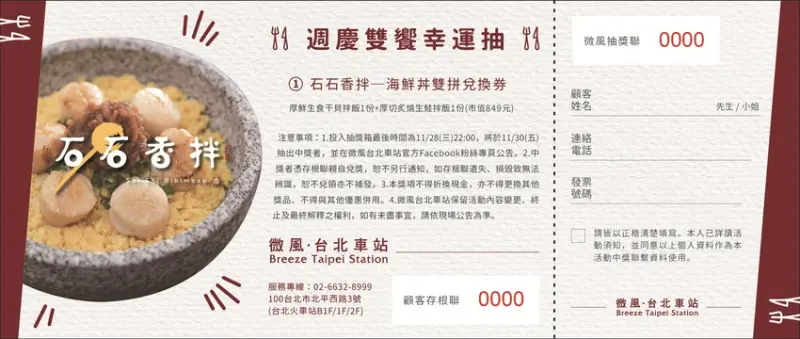 活動方法:活動期間憑微風台北車站全館單筆消費滿1,200元以上之發票,即可兌換「雙饗幸運抽-抽獎券」乙組(兩份);單筆消費滿2,400元以上獲二組,以此類推。(限量共55份) 獎項內容:「石石香拌-海鮮丼雙拼兌換券」、「港苑–獨饗金1500元」![]()