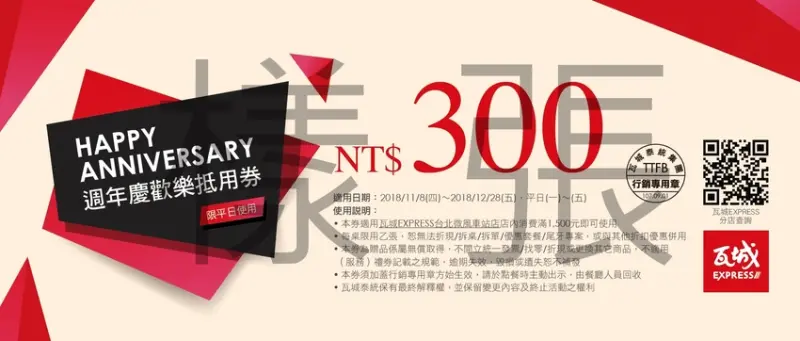 活動方法:活動期間憑全館當日累積消費滿1,000元之發票,即可兌換「瓦城Express-商品折價券」乙份,限量500份,贈完為止。(限微風台北車站使用)![]()