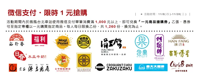 活動期間內於微風台北車站使用微信支付單筆消費滿1000元以上,即可兌換「一元商品搶購券」乙張,憑券可至指定專櫃以一元購買指定商品。每日每人限換乙份,共1,300份,贈完為止。![]()