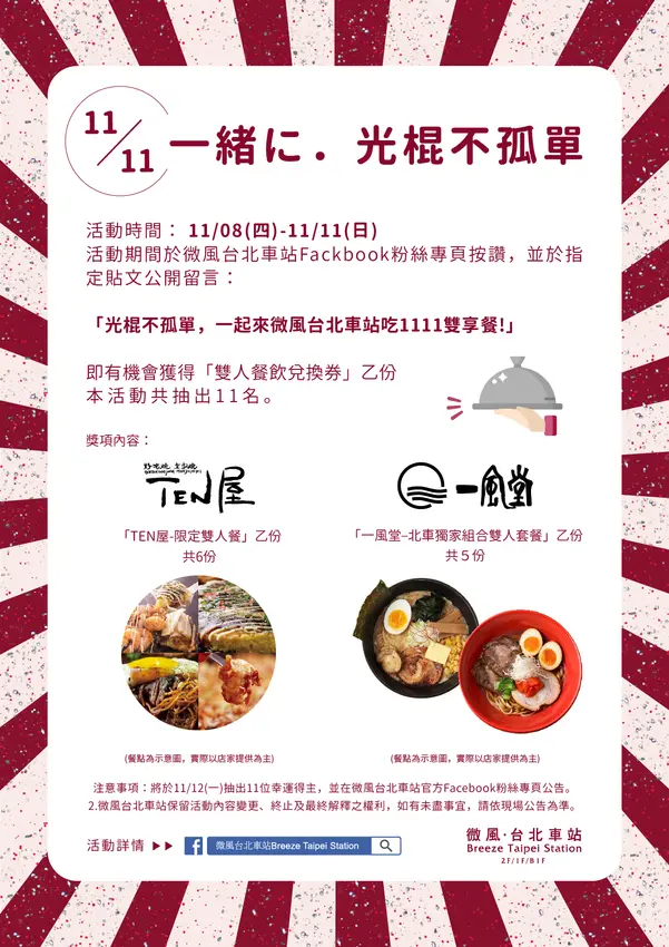 活動方式:活動期間於微風台北車站FB粉絲專頁按讚,並於指定貼文留言:「光棍不孤單,一起來微風台北車站吃1111雙享餐!」(設公開),即有機會獲得「雙人餐飲兌換券」、乙份,本活動共抽出11名。獎項內容:「TEN屋-限定雙人餐」、「一風堂–北車獨家組合雙人套餐」