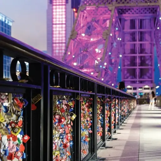 仿照巴黎「藝術橋」而建的「愛情鎖橋」是沐浴於濃情蜜意的戀人必訪之地,到五樓的「巴黎鐵塔紀念品商店」購買一把愛情鎖,在鎖上寫出小倆口愛的宣言,再把鎖扣在橋上,喻意兩心永扣!