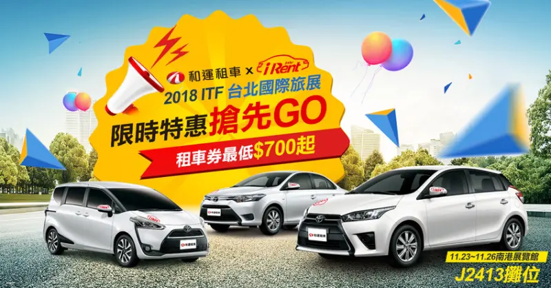 「2018台北國際旅展」將於11/23-11/26首度移師南港展覽館,也是國內租車領導品牌-和運租車一年一度參加的展覽,本次也推出多項超值租車商品,消費者可把握機會到攤位號J2413,購入超殺折扣42折起租車商品,享受和運租車的優質服務!
