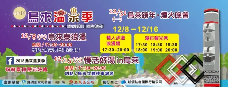 到烏來只能泡湯賞景享美食?今年的「2018烏來溫泉季」絕對讓遊客耳目一新。新北市烏來區公所舉辦的『烏來泰浪漫』活動,即將進入最浪漫的時刻。本周六(12/08)烏來瀑布將在夜晚定時演出炫麗奪目的聲光秀;而情人步道也將被滿滿的燈飾所點亮。烏來區公所歡迎遊客們來體驗只有限期九天的烏來泡湯新美學概念。