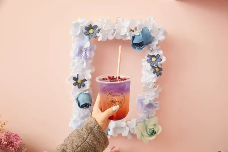 最流行的漸層氣泡飲喝起來酸甜解膩,一定要拿在手中與玫瑰花牆拍一張