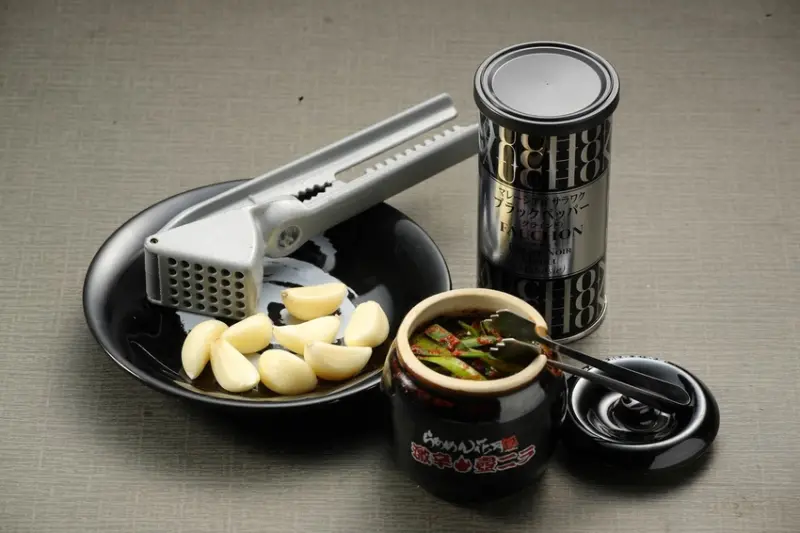 每桌都備有一壼陶罐裝的嗆辣韭菜壼,是每日以新鮮韭菜醃拌特製辣醬現作的獨家漬物,加入麵湯中滋味絕妙,各種湯頭都適合,嗜辣者必加。
