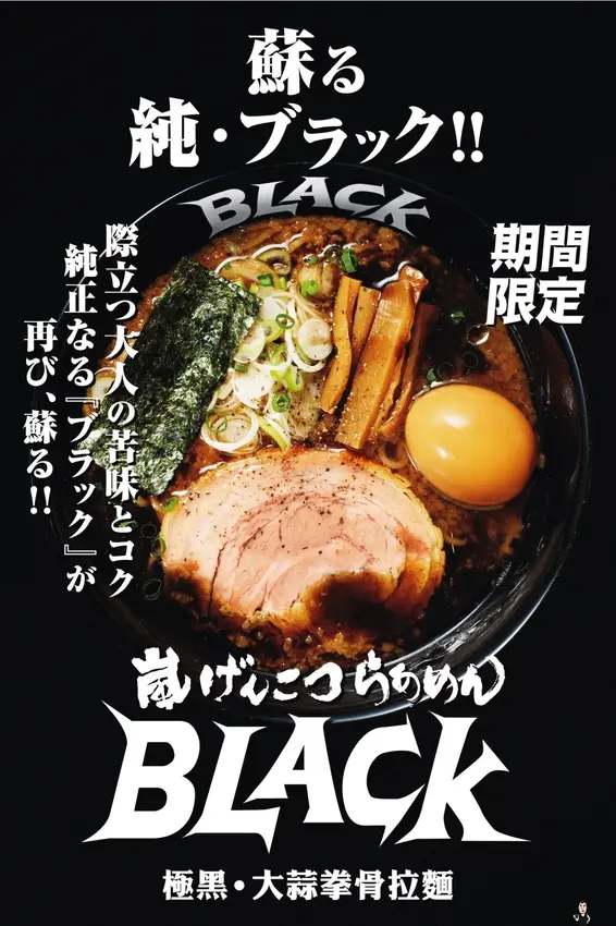 新的一年要以爆炸重口味揭開序幕,花月嵐每回推出備受好評的期間限定NO.1『BLACK極黑‧大蒜拳骨拉麵』1/7千呼萬喚再登場!以慢火將大蒜細細炒至深褐焦香,提煉成祕方『深煎焙香蒜油』,只要淋上一匙在大蒜拳骨湯頭中,濃郁蒜香撲鼻,隱微苦味之後濃烈厚實卻圓潤的強勁美味一波波襲來,加上煙燻炙燒叉燒及糖心蛋,是熟男熟女才懂得欣賞的『成熟大人味』!