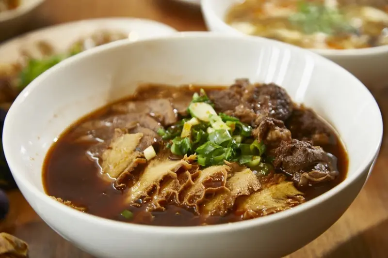 一樣使用手工麵條,碗裡軟嫩多汁的牛肋條搭配精滷的牛肚跟牛腱,有別於市面上重口味的紅燒湯頭,翟九的牛肉湯採各式中藥材與牛骨、雞骨、豬骨以及新鮮洋蔥熬煮,清甜的湯頭深獲饕客喜愛。