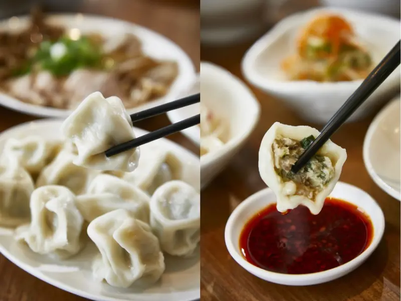 特選飼養18個月黑豬肉,將肥肉打成漿與瘦肉和勻後,加入梨山高麗菜與宜蘭青蔥提味,再以手工水餃皮包上,用心在每個細節讓原料巧妙融合互不搶戲。沾點自製辣油配上一碗中藥胡椒粉提味的酸辣湯,堪稱一絕!