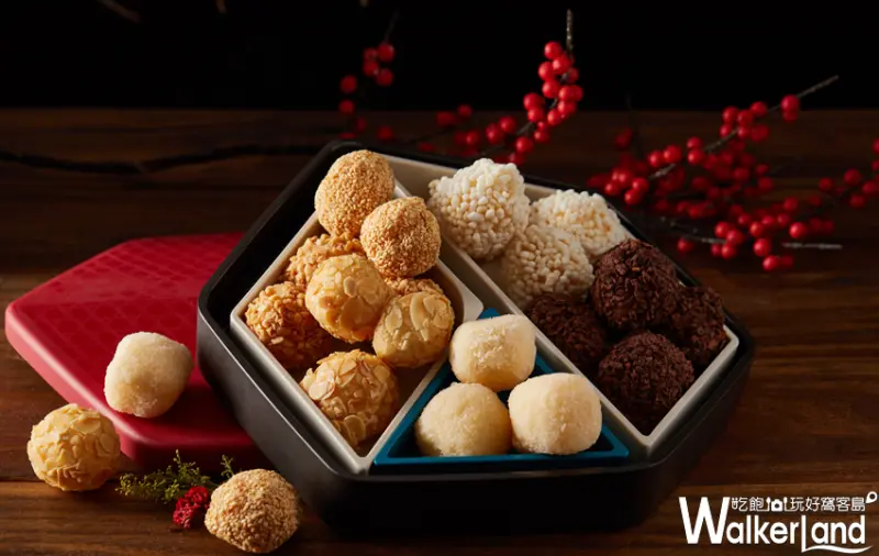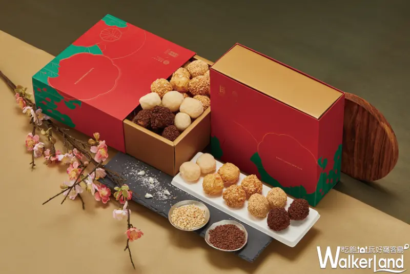 另一款「福氣丸甜品禮盒」則是年節必吃的綜合口味麻粩,精選台灣九頭芋與低熱量的海藻糖製成,淋上香脆杏仁片、香脆花生角、濃郁椰子粒或香醇芝麻粒等,外層充滿堅果香氣,內裏酥脆篷鬆,象徵福氣圓滿。