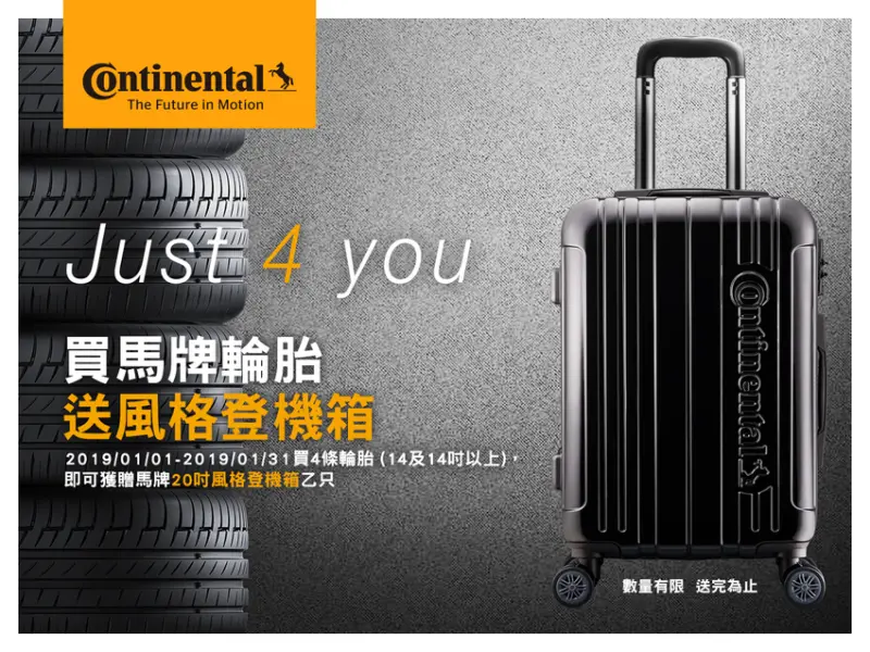 消費者凡於2019 年 1 月 1 日 至1 月 31 日 期間,到全台德國馬牌輪胎簽約店家,購買4條馬牌輪胎(14 吋及14吋以上)即送馬牌20吋風格登機箱一只,新年換好胎,不論春節返鄉、出國旅行,都有馬牌做堅實的後盾,讓經典與您安全箱伴。![]()