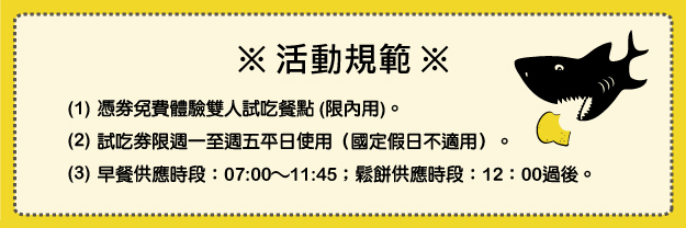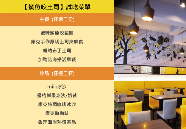 從台中竄紅,擋不住的人氣直搗台北!超海派的早午餐店~鯊魚咬土司來啦!餐點兼具份量與細緻風味,希望來的客人都能像鯊魚一樣豪邁的大口品嚐!【窩客島搶先獨家推出雙人試吃套餐】,蜜糖鯊魚咬鬆餅、加勒比海樂活早餐、庫克手作厚切吐司,哇賽~這次超多的餐點,讓你自由挑選!