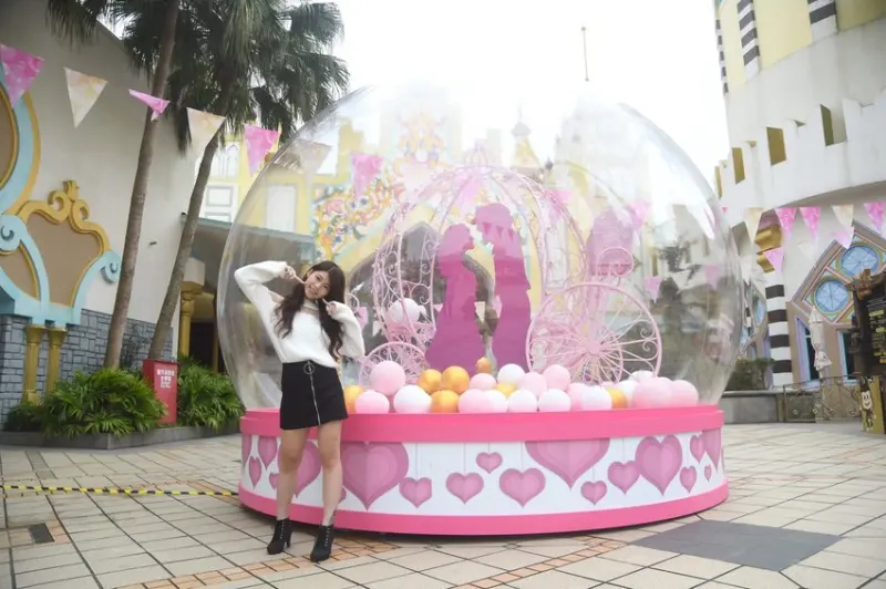 三米高的巨型水晶球裡有夢幻馬車以及迷你的公主與王子,就像把童話故事中的幸福場景通通裝進了水晶球中,結合粉紅配色,充分滿足甜滋滋的少女心,保證快門按不停。充滿戀愛粉紅泡泡的浪漫場景,絕對是你必須打卡的熱點。