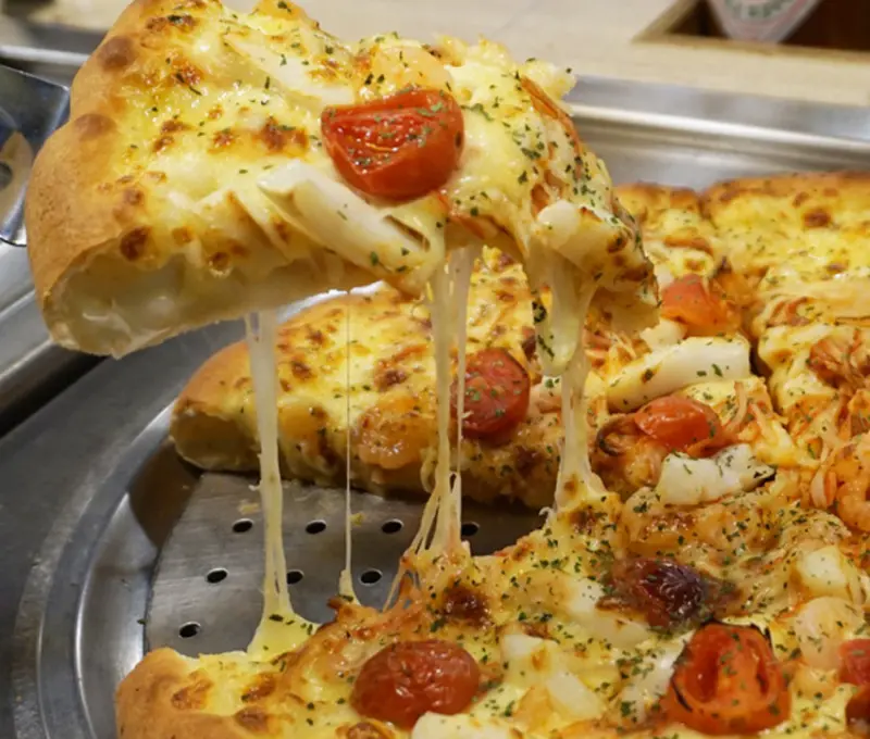 芝心比薩手腳慢就吃不到啦!人氣口味「海鮮比薩」常常一上比薩吧就馬上被拿光,大口咬下有滿滿起士的海鮮芝心比薩~ 真的好幸福呀!你看看那個牽絲~ 啊斯!