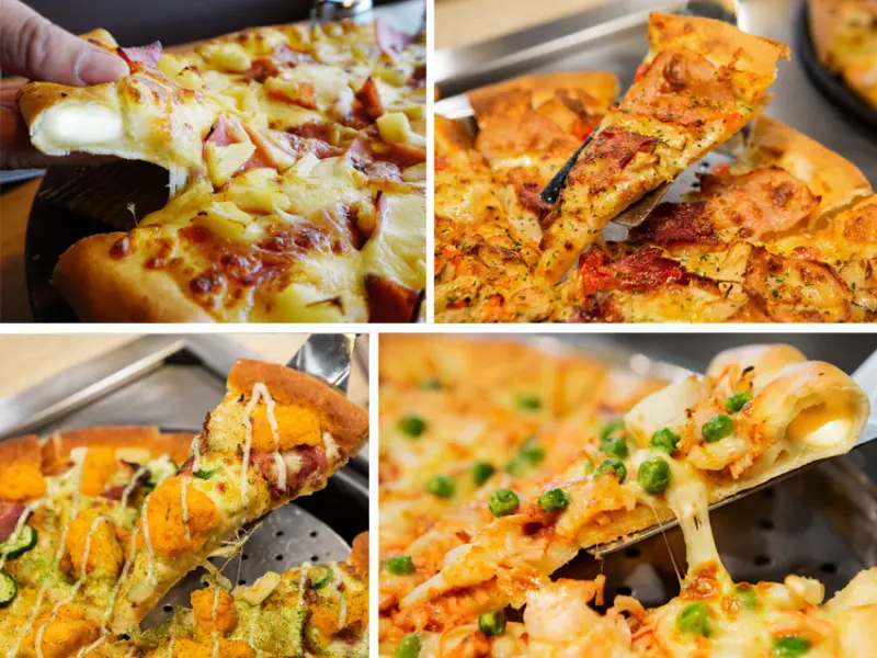 13種不同風味的多種口味比薩要帶給你最幸福的選擇!配上大人和小朋友都超愛的芝心比薩~難怪能成為小資家庭心中的第一名親子餐廳呀!快來猜猜看下面有沒有你愛吃的比薩口味?答對了嗎?左上為「夏威夷芝心比薩」右上為「炙燒松坂比薩」,左下為「黃金和風雞」。