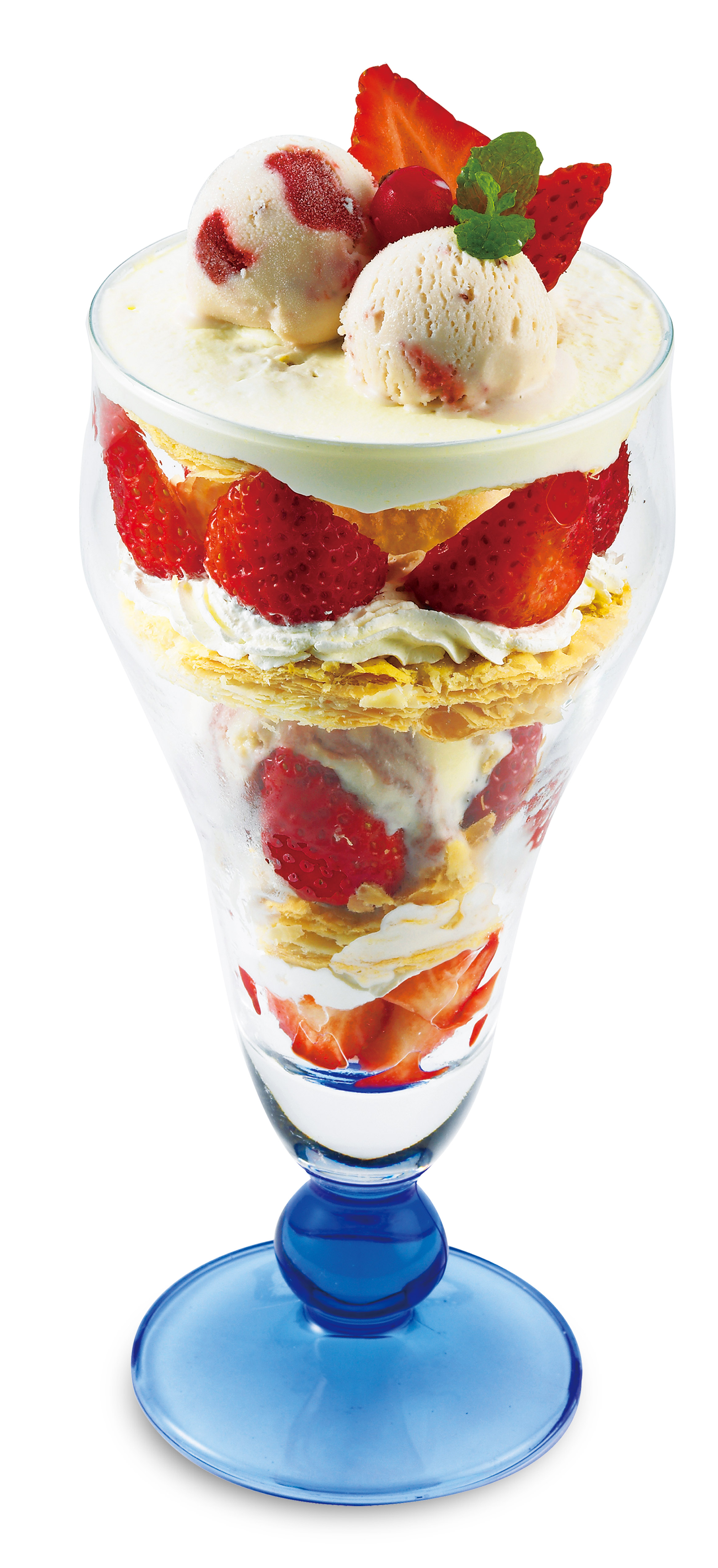 法式可麗餅搭配經典草莓冰淇淋及清新的桑果和芒果雪酪,佐以新鮮草莓及香蕉,揮灑上巧克力醬及杏仁片。