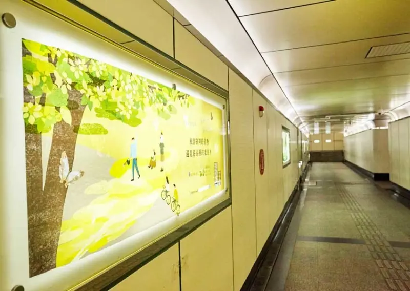 繼續往前走,便能走到通往台大與公館商圈的地下道,記得停下腳步看看廣告燈箱,獨特魚木燈排突顯台電兼具科技與人文的用心。