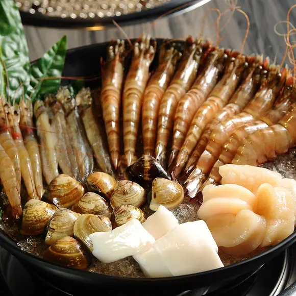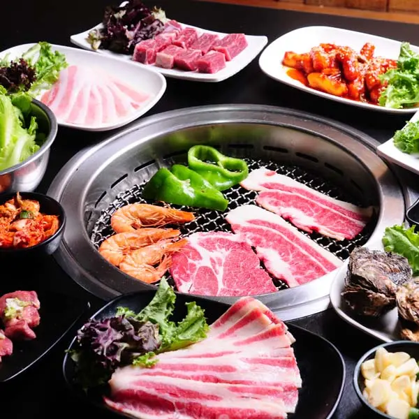 特級霜降豬肉、鹽烤梅花肉、韓式醃醬梅花肉、海鮮豆腐鍋和起司海鮮炒年糕