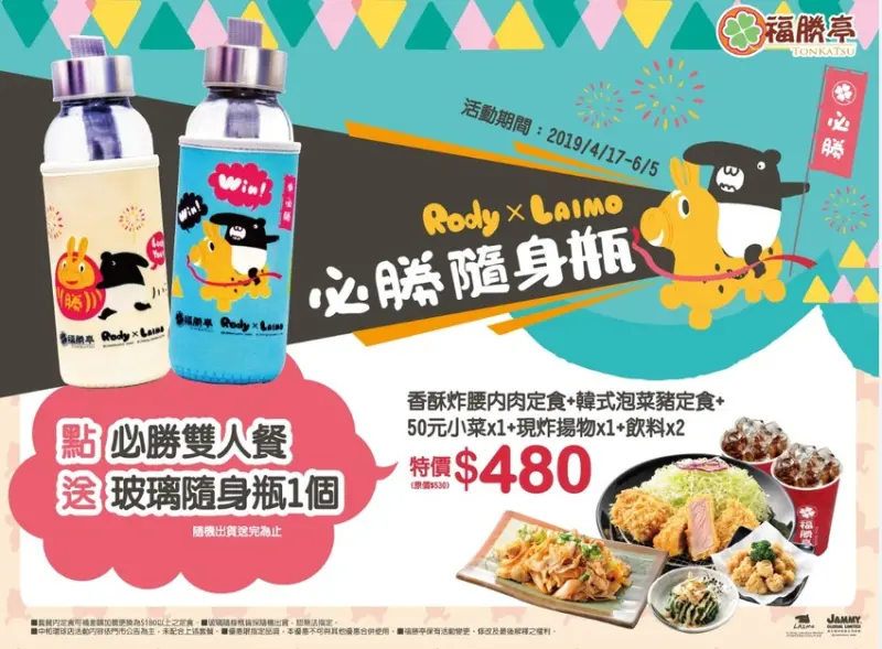 近期各種跨界聯名概念店帶動起踩點打卡的熱潮,吸引各種消費者及粉絲朝聖。福勝亭這次找來「RODY跳跳馬 x LAIMO馬來貘」合作,全省門市共同推出聯名限量贈品,即日起至6月5日,凡是購買必勝雙人餐,特價$480,現省50元,再送RODY x LAIMO玻璃隨身瓶!