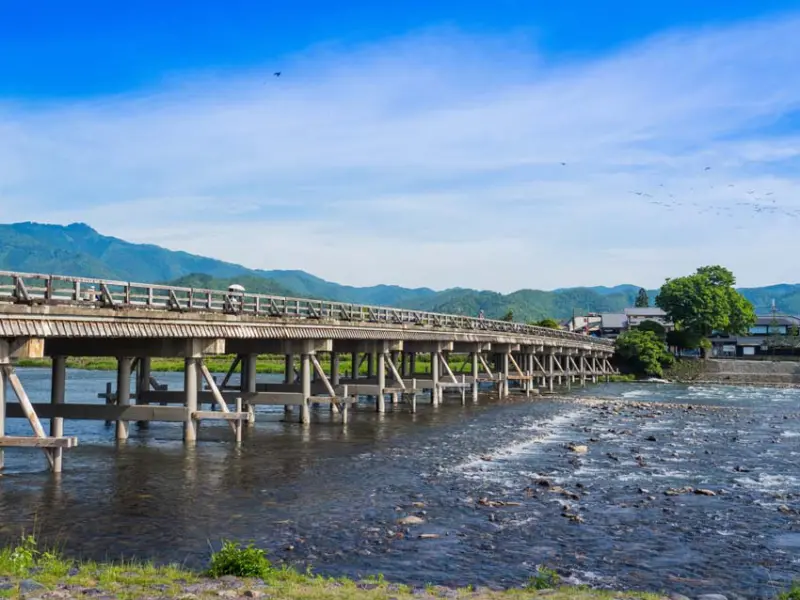 走完竹林之道後,慢慢的走到渡月橋吧!漫步河畔景色,感受古都風情。嵐山有許多值得造訪的知名景點,其中,也可以到別名「嵐橋」的渡月橋上面走走,橫跨在京都嵐山的大堰川上,全長155公尺,隨著四季更迭,展現應時的絕妙風光。