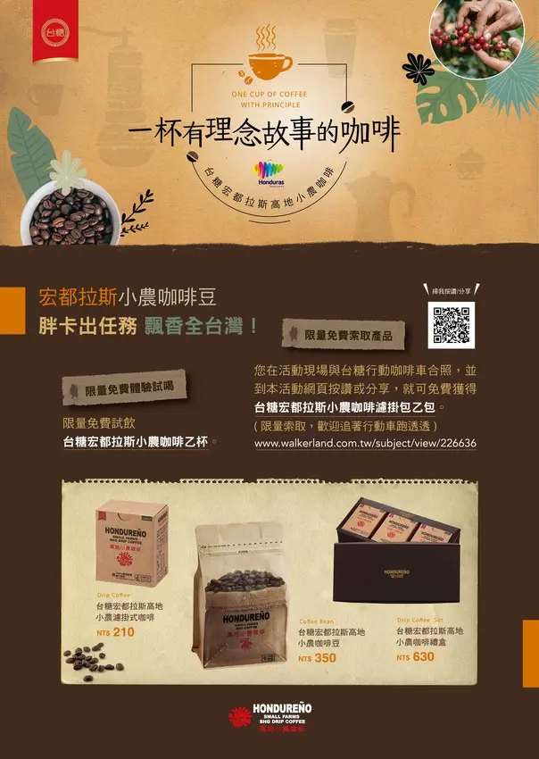 您在活動現場與台糖行動咖啡車合照,並到本活動網頁按讚或分享https://www.walkerland.com.tw/subject/view/226636,就可免費獲得台糖宏都拉斯小農咖啡濾掛包乙包 (限量索取, 歡迎追著行動車跑透透) !