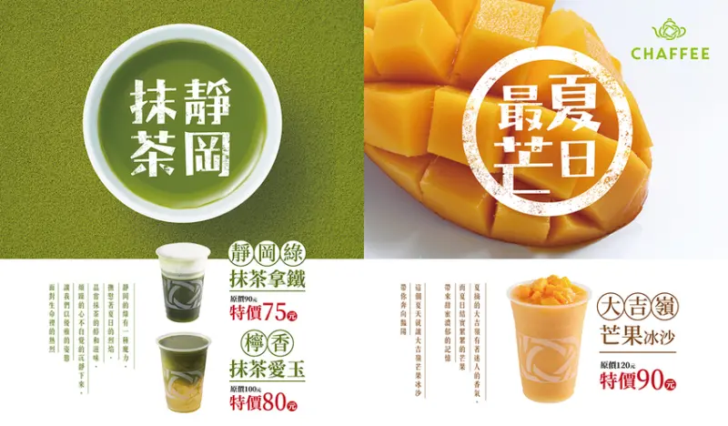 今夏,天仁茗茶旗下品牌「CHAFFEE」同樣引領潮流,除了推出人氣王「大吉嶺芒果冰沙」,更推翻傳統思維,將愛玉玩出新花樣,挑戰今夏最潮混搭「檸香抹茶愛玉」!不管你是芒果愛好者還是抹茶信徒,CHAFFEE都讓你成為一個走在最前面的吃貨!