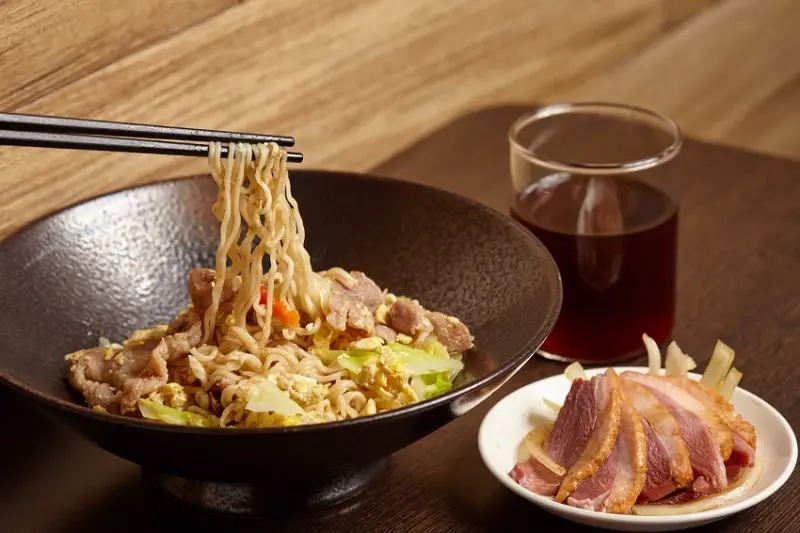 十夜泡麵館除了提供各式各樣不同國家的特色泡麵料理外,還有手工甜點及素食,讓您有多樣的選擇,其中就以炒泡麵最受到客人的歡迎。而這一次與出前一丁跨界合作,結合出前一丁黑蒜油豬骨湯味速食麵,聯手推出期間限定創意套餐─「出前一丁涼鴨炒麵套餐」!