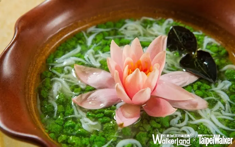蓮花仙子羹,放入菠菜、魩仔魚、金線蓮,再畫龍點睛擺放蓮花,極具美感,也成為鎮店名菜。金都餐廳