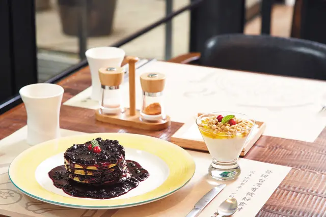 ▲藍莓鬆餅380元(左)/採用有機原料製成,還可以吃到果仁的口感,很有飽足感。棉花田鮮奶優格180元(右)/純鮮奶發酵的手工優格吃起來清爽無負擔。
