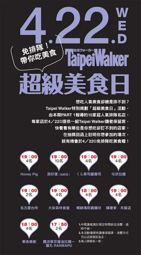 「Taipei Walker超級美食日」活動,提供10組名額讓你享受「免排隊」的小確幸