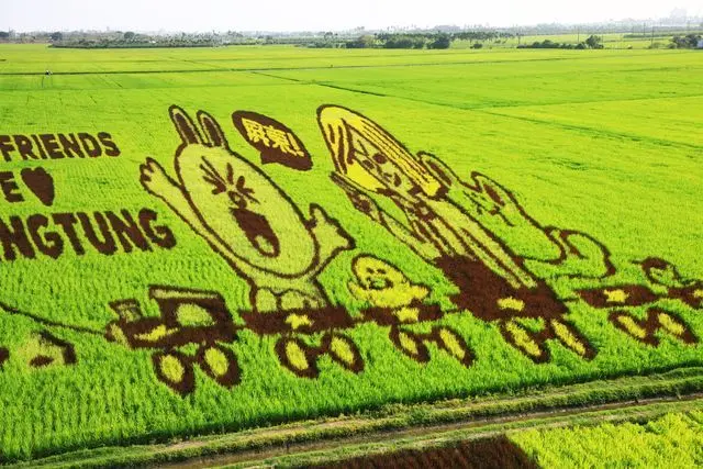 ▲手機最火紅的LINE貼圖出現在田間水稻裡,熊大、兔兔、莎莉真是超級壯觀的流行焦點。