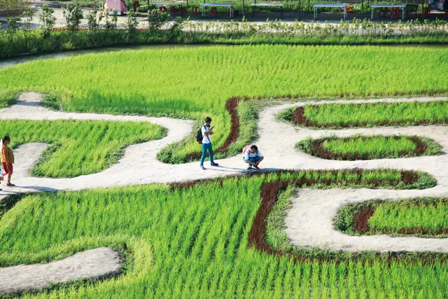 ▲稻浪迷宮呈現安居樂業四個大字,最適合親子共遊體驗找出口。