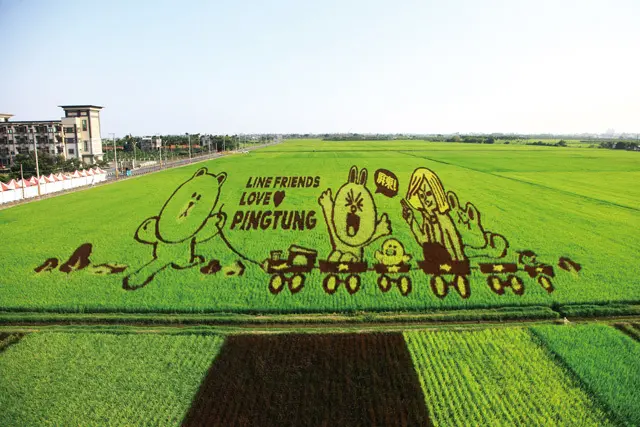 ▲在滿滿的秧苗田上有熊大與兔兔等LINE主角耍萌奔跑著,你想不想親眼目睹這片可愛的稻田,就在溫暖的南台灣。