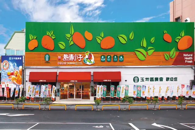 ▲由黃澄清於2011年創立的玉井區農會熱情小子芒果冰館,以明亮色彩的外觀吸引遊客,並以玉井舊地名「噍吧哖」(Tapani Paradise)作為品牌名稱,藉此推廣自家芒果。
