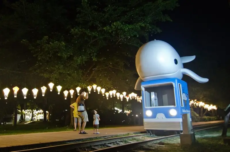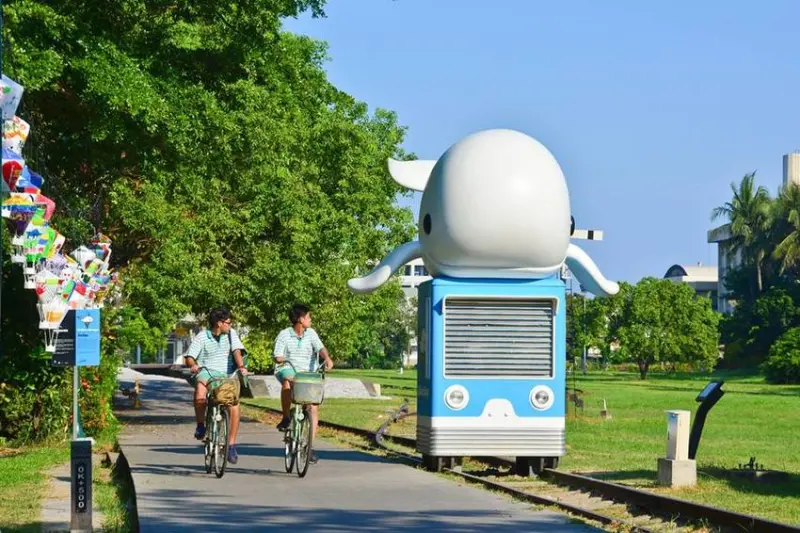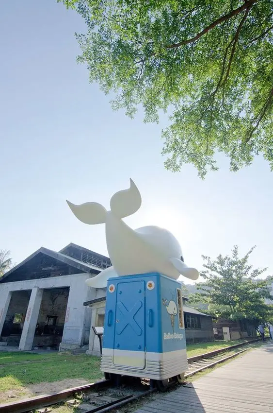 由藝術家AKIBO李明道創作的【叭噗白鯨冰淇淋】,將卑南族的古老大魚傳說,揉合鐵道文化,轉化為親切趣味的白鯨造型,座落於舊火車機關庫房旁的鐵軌上,相當吸睛!小白鯨在即日起每逢六日的下午3點起至晚上9點,每整點均會啟動背上的泡泡機,有空的話大小朋友一起來鐵花新聚落逛逛吧!