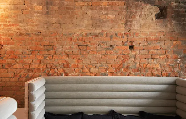 ▲位於三樓的半開放式包廂區,牆面仍保留老屋的大片紅磚建材,斑駁痕跡讓人懷念起舊時光。
