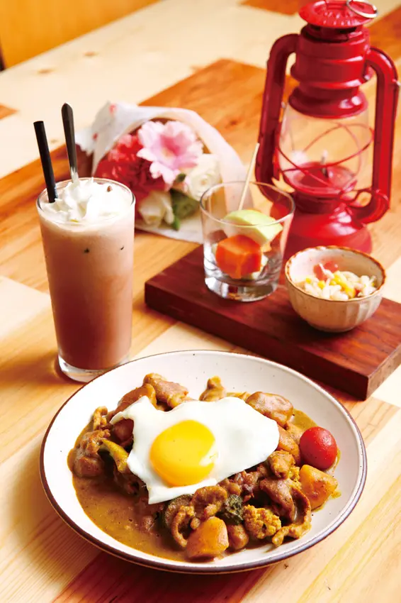 ▲大人吃的咖哩飯280元(前)/取這樣的名字,是因為口感微微嗆辣,比較不適合小朋友吃。裡面加了大量香料,還有櫛瓜等季節性蔬菜,並以薑、蒜提味,滋味回甘。黑摩卡拿鐵150元(後)/加上黑巧克力的拿鐵咖啡,夏天冰冰喝,口感暢快。