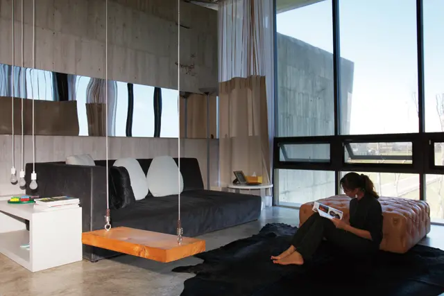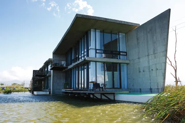 ▲猶如浮在水面上的前衛建築,曾獲2006年台灣建築獎佳作殊榮,並設計需通過許可才能由自動收縮的橋樑進入,為旅客創造高度隱私空間。