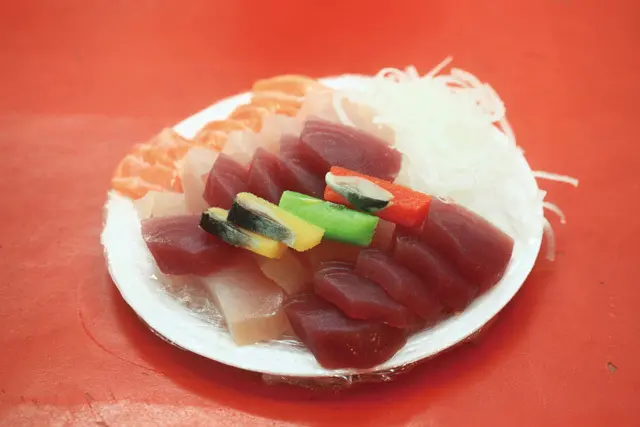 ▲綜合生魚片(20片)100元/旗魚、鮭魚全是後壁湖漁港現貨,新鮮料好實在,百元生魚片超值實惠。