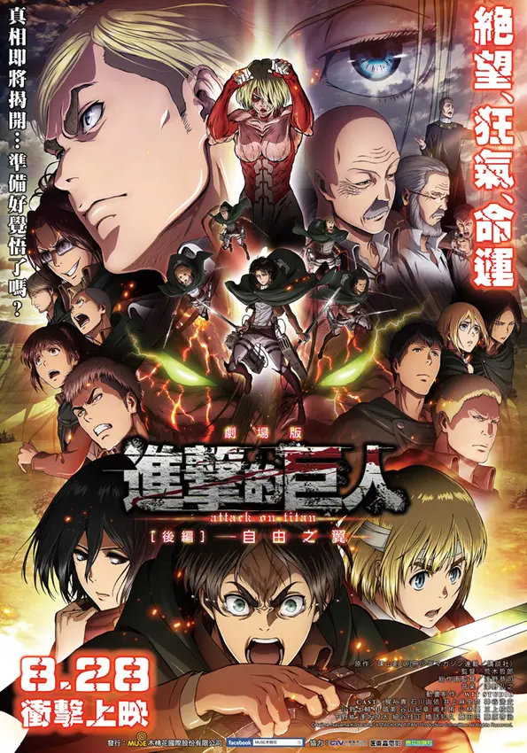 前編劇情敘述人類世界被巨人支配而維持著表面的和平,因艾連突然變身為巨人,而打破人類和巨人間的隔閡,隱藏著巨人秘密情報的《劇場版後編-自由之翼》,即將於8月28日上映!真相將要揭開,準備好覺悟了嗎?人類是否能重獲自由?一起到電影院感受為自由而戰的衝擊,為人類獻出你的心臟!