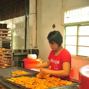 ▲(中)盛發芒果乾的製作工廠,無數碩大甜美的新鮮芒果即將製成芒果乾。