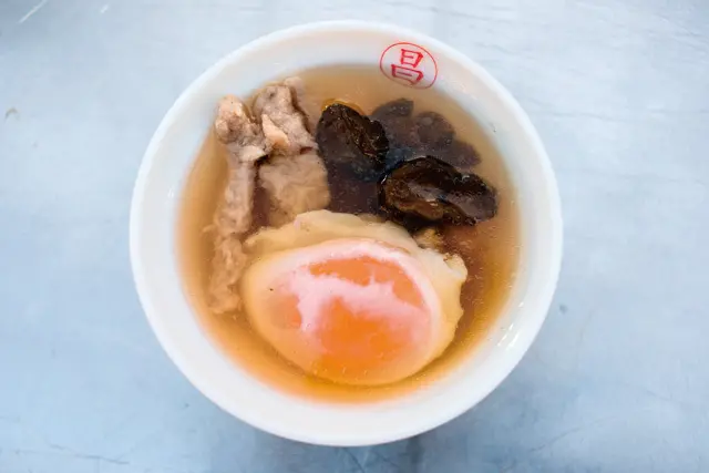 蛋包瓜仔肉湯/55元/半熟鴨蛋包、赤肉、醃花瓜組合而成的湯品,鹹中帶甜的湯頭在劃破蛋黃後,與蛋汁混合出濃郁口感,紮實赤肉與清脆瓜仔是不變的絕妙搭配。