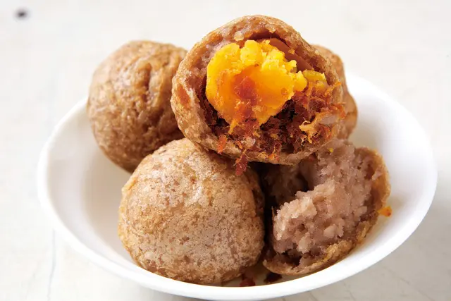蛋黃芋餅/個/20元/經過揉捏將芋泥中包入豬肉脯和半粒鹹蛋黃下鍋油炸,咬下後先是感受到外層酥脆鬆軟,芋香撲鼻,接著內餡綿密芋泥搭配鹹蛋黃與豬肉脯,鹹甜香滋味層層交疊,若偏好綿密香甜的樸實口感可選擇香酥芋丸。
