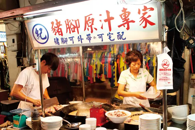 夜市知名老店,其原汁豬腳是以大骨及豬腳慢火熬製,乳白色湯頭無需添加調味料,一入口便是香醇甘甜,毫無腥味;且因燉煮時間長達16小時,湯汁含有大量膠原蛋白,堪稱天然的美容聖品。