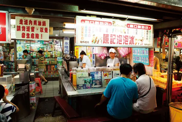 夜市代表名食之一,推出口味將近20種。泡泡冰的作法是將冰刨得非常綿密,再依客人的喜好,將花生醬或煮得爛透的花豆等食材,用力攪拌直至完全融入刨冰中,每一口都很柔細且香氣濃郁。