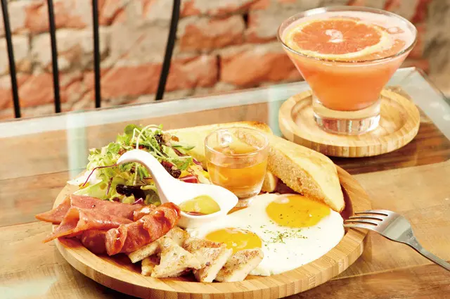 ▲日安奈野組合餐220元(前)/豪邁的擺上了煙燻火腿、香腸、雞胸肉與奶油巧巴達麵包,你想要的美味這一盤通通有!葡萄柚汁140元(後)/新鮮的水果汁開啟美好的一日。