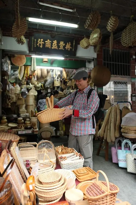 由北往南,水瓶子一路領我們拜訪不同的老行業。在百年商行「老綿成燈籠店」的亭仔腳,第三代傳人張女士正拿著毛筆在燈籠上寫字;「永興農具工廠」經時代變遷,營業品項擴展至鑄鐵器具,以及竹製廚房道具等,吸引不少外國遊客造訪;「林豐益商行」也是守著百年產業,販售各式傳統竹器與木器;而提供進口食品和南北貨的「天山行」,老屋第一進展示了來自各方的好食材,後面為倉庫與住家,街屋功能從未改變。
