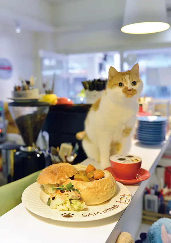 在巷弄中Sam咖啡是一間寵物友善咖啡店,天氣好時,老闆就會帶著店貓圈圈一起上工,店內沒有專門為毛小孩設計的餐點或玩物,而是自然地讓人與貓形成和諧畫面,另外還有一隻流浪貓名叫黑金,每天都來店裡報到,不過有時會在外玩耍而不見貓影。而Sam咖啡最知名的就是飲品上的可愛拉花,現共有種圖案飲品讓客人選擇,不同於一般拉花,這裡使用翻糖蛋糕糖漿、法國進口果泥等,畫出繽紛可愛的圖案,除了可愛,飲品採用義大利空運來台的頂級品牌咖啡豆、可可,餐點新鮮現做,真材實料讓視覺與胃都得到滿足。